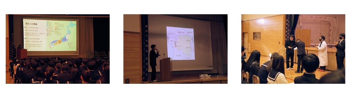 令和7年度「総合的な探究の時間」における探究成果発表会を、12月10日(水)の3・4校時に本校体育館で開催しました。対象は1・2年次の生徒で、ポスターセッションで金賞を受賞した1年次3グループ、2年次5グループが「思春期とコミュニケーションの関係性」(2年・個人)や「難しい言語なのになぜ日本語は評判が高いのか」(1年・グループ)などの発表を行いました。本発表会は、探究活動の成果をまとめて他者に伝えることで江南力の伸長を図り、他者の発表を聞くことで自身の探究活動を振り返る機会とするとともに、生徒と教員双方の視点から評価を行い、学校全体の探究活動の質を高めることを目的としています。発表者は、グループで立てたリサーチクエスチョンに基づき、探究背景、意義や手法、結果考察の4点を盛り込んだスライドを作成し、成果を発表しました。審査員は校長及び5名の教員で担当し、生徒たちの取り組みを評価しました。探究活動の集大成を披露する場として、また互いの学びを深め合う場として、学校全体で意義ある時間となりました。
