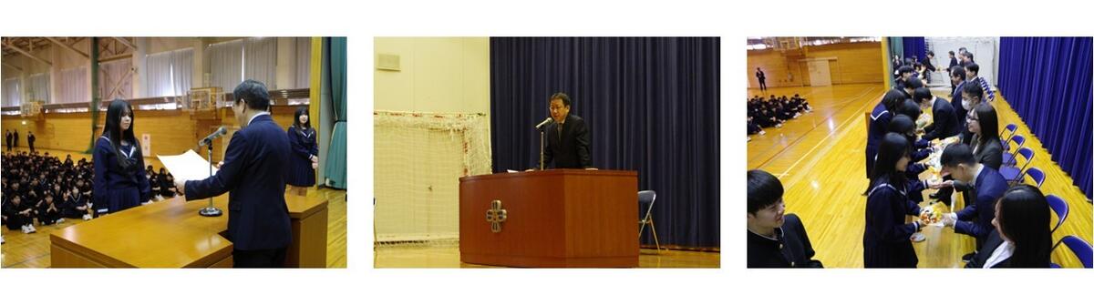 続いて行われた修了式では、校長講話として「いじめ防止対策推進法」の趣旨を踏まえ、いくつかの事例を提示し「これはいじめに当たるか」を生徒が挙手で考える形式で進められました。生徒一人ひとりが、改めていじめについて考える機会となりました。