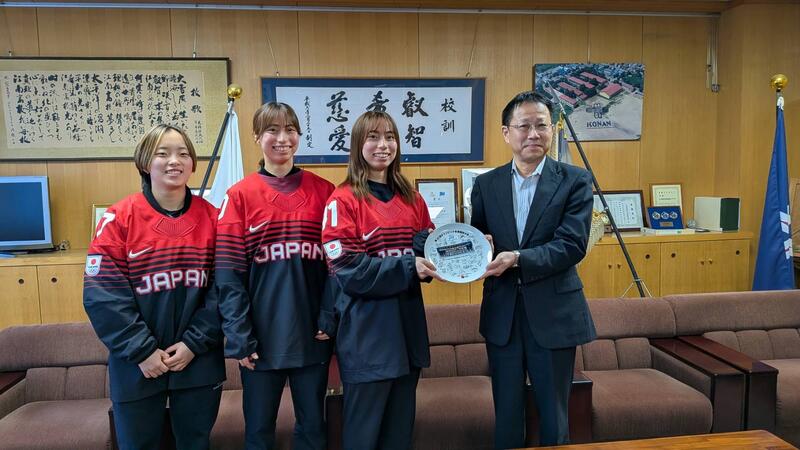 3月17日、ミラノ・コルティナ2026冬季オリンピックに女子アイスホッケー日本代表として出場した、本校同窓生の野呂莉里さん・里桜さん(73期生)、多田藍さん(75期生)が来校し、大会の報告と記念品の贈呈が行われました。