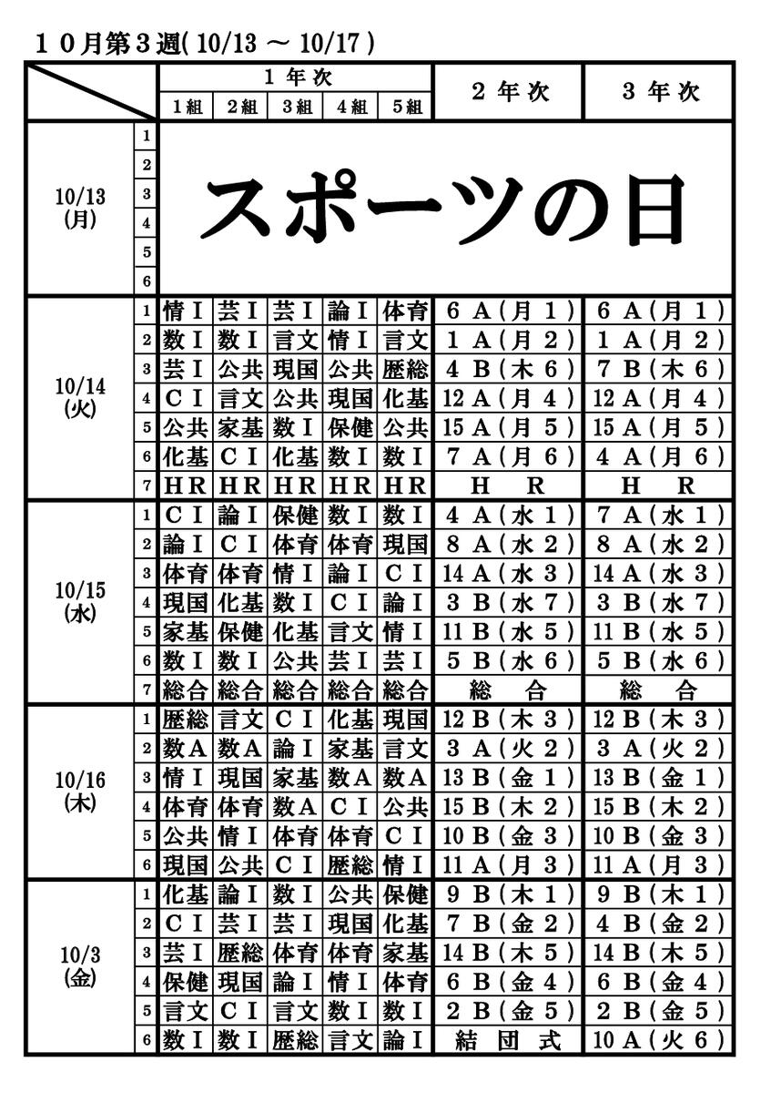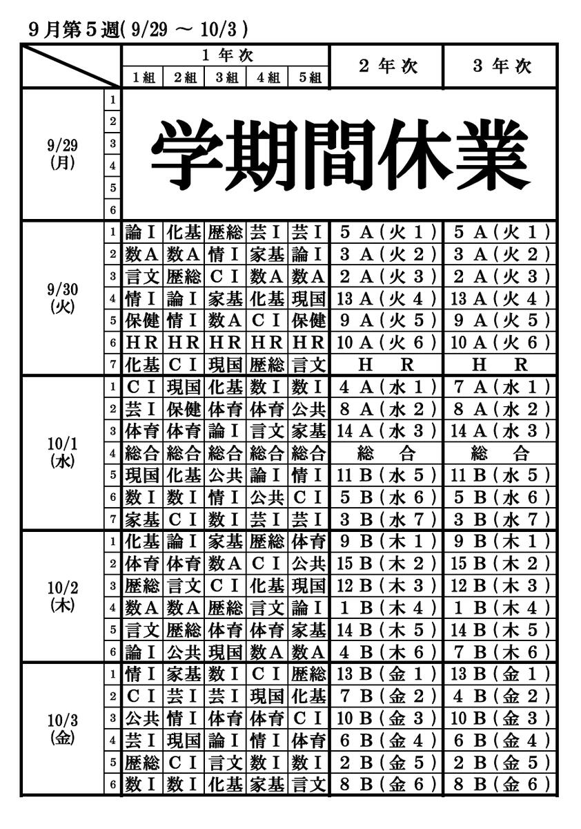 時間割9月29日~10月3日