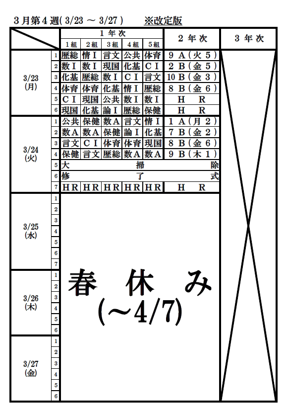 時間割3月16日~3月24日(改定版)